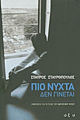Κοιτάξτε, το «Πιο νύχτα δεν γίνεται» είναι ένα βιβλίο οριακό, οι άνθρωποι δρουν ως πρώην πρόσωπα. Τους έχει αφαιρεθεί η δυνατότητα της ζωής. Ουσιαστικά, ζουν τον θάνατό τους, χωρίς να τον κατονομάζουν. Υπάρχει ένας πόλεμος βλεμμάτων, εικόνων, σιωπών. Και ο λόγος που βάφει. Που παρακολουθεί τα ίχνη της καταστροφής, της εκθεμελίωσης. Είναι ένα πολύ φιλόδοξο εγχείρημα, μια απογραφή ενός ιστορικού κύκλου. Ενός καιρού των ανθρώπων. Που τελειώνει.