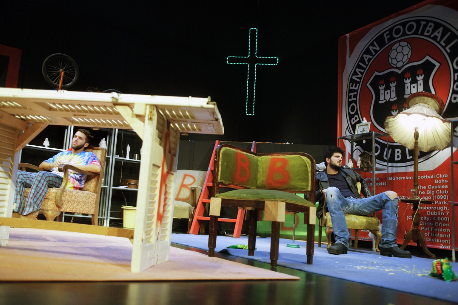 Στον τοίχο το λάβαρο της Bohemian F.C. Dubliners, στα ηχεία νεορόκ μπαλάντες για την κατάθλιψη, ψηλά στη γωνία ένας φωτισμένος σταυρός, στο ακατάστατο «καθιστικό» δυο πολυθρόνες. Βρισκόμαστε στο πατρικό σπίτι δύο Ιρλανδών αδελφών, του Κόλμαν και του Βαλέν. Μόλις έχουν γυρίσει από την κηδεία του πατέρα τους που σκοτώθηκε σε ατύχημα κι από τις πρώτες τους κουβέντες αντιλαμβανόμαστε τις μονομανίες τους: ο Κόλμαν πηγαίνει στις κηδείες για να τρώει, ο Βαλέν έχει έμμονη ιδέα με θρησκευτικά αγαλματάκια που αγοράζει σωρηδόν. Αλλά η μεγαλύτερή τους μανία είναι κοινή: βρίσκονται σε μόνιμο μάλωμα, σε διαρκή κόντρα. Τσακώνονται για το ουίσκυ, τα πατατάκια, την καινούργια κουζίνα και τα περιοδικά του Βαλέν. Σ’ αυτά συναντιούνται κάθε φορά για να αλληλοσπαραχθούν: για τον Βαλέν είναι η επίδειξη της ανωτερότητάς του, άρα για τον Κόλμαν η ευκαιρία να τον ταράξει. Εκεί άλλωστε επενδύουν τα κενά τους: ο παρασιτικός Κόλμαν διασκεδάζει με την «παράτυπη» οικειοποίησή τους, ο κτητικός Βαλέν επισφραγίζει την ιδιοκτησία του με μαρκαδόρο.