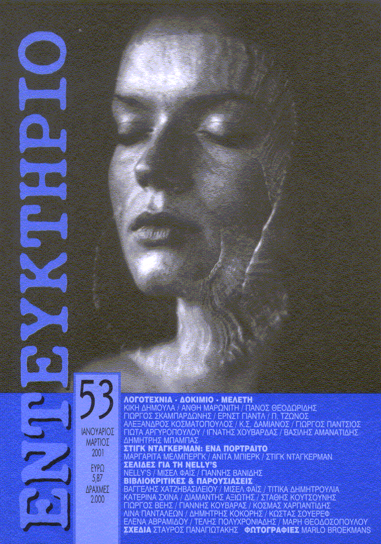 Έξω: το ανοιχτό βλέμμα των συγγραφέων, το κλειστό μιας μούσας κι ένα χρώμα ως πλαίσιο. Μέσα: αμέτρητα βλέμματα συγγραφέων, μούσες και χρώματα στις ένθετες ιστορίες των ανεξάντλητων λογοτεχνικών περιοδικών.