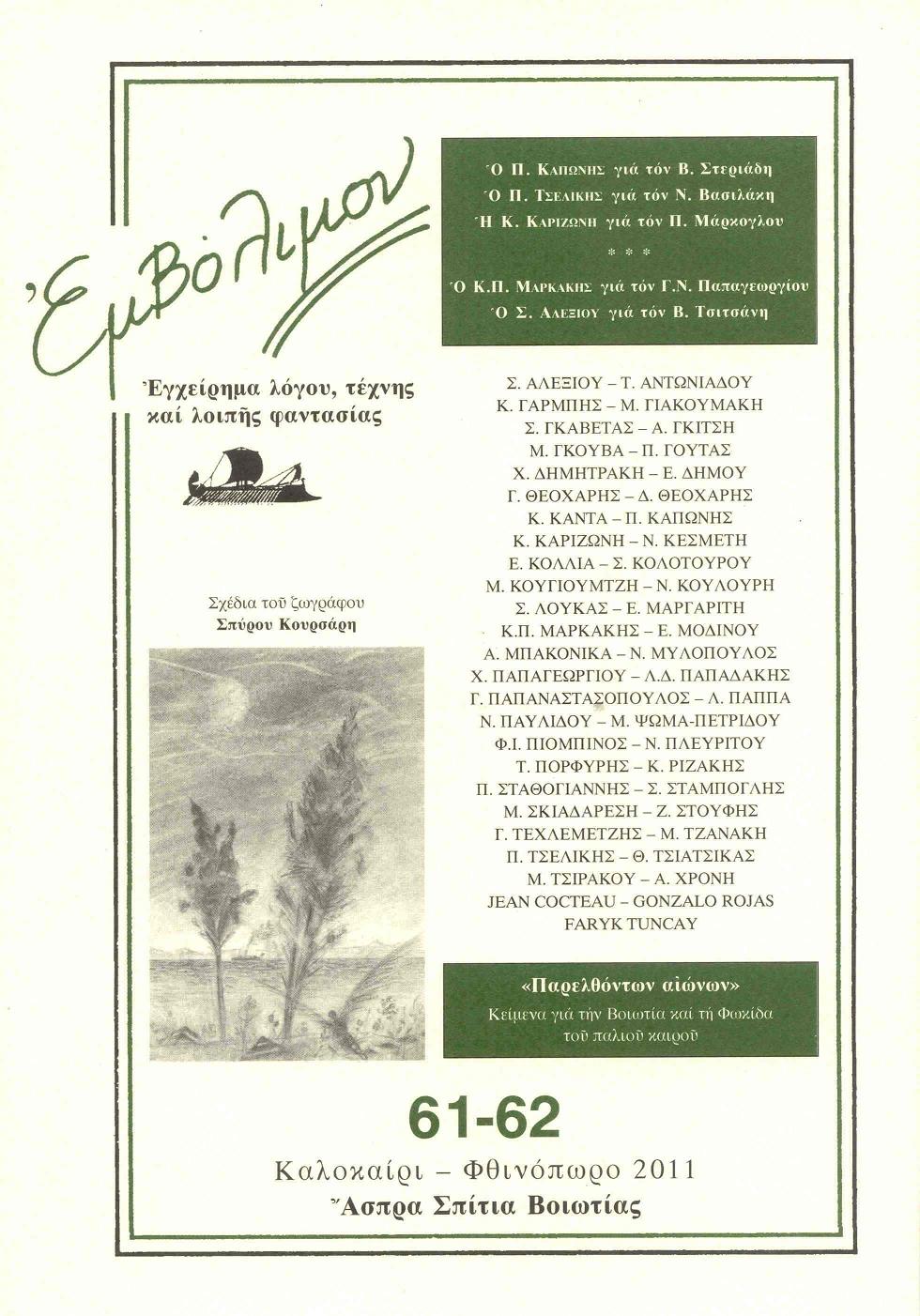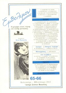 Ολοκληρώνεται σήμερα η παρουσίαση των έξι τελευταίων τευχών του Εμβόλιμου (πέντε διπλών και ενός «μονού» και με ελαφρώς ανορθόδοξη σειρά), μια παρουσίαση που μπορεί να μην εμφανιζόταν, ως όφειλε, κατά το χρόνο της έκδοσης του κάθε τεύχους, αλλά τουλάχιστον ακολούθησε την δική μας αναγνωστική άποψη πως τα εγχώρια λογοτεχνικά περιοδικά, και σίγουρα το Εμβόλιμον, δεν διαβάζονται μια κι έξω, μονορούφι, αλλά παίρνουν μια θέση στο ράφι εκείνο της βιβλιοθήκης που είναι «διαθέσιμο» για κάθε στιγμή, ευκαιρία και διάθεση. Στην ουσία έρχεσαι κι επανέρχεσαι σ’ αυτά ανάλογα με την αναγνωστική επιθυμία που ικανοποιούν τα αυτοτελή τους κείμενα: πεζό, ποίηση, κριτική, δοκίμιο, μελέτημα, άλλου είδους σημειώματα. Είναι άλλωστε γνωστό πως οι αναγνώστες μπορούν να βρουν παλαιότερα τεύχη (που είναι το ίδιο – δηλαδή πάντα – επίκαιρα με κάθε τρέχον τεύχος) επικοινωνώντας με το εκάστοτε περιοδικό.