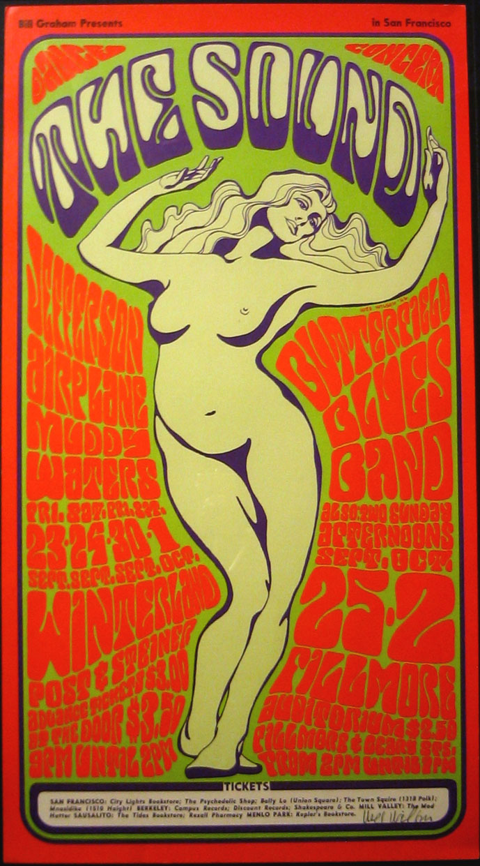 Το L.A. αποτελεί πλέον το κέντρο της ψυχεδελικής ροκ: Seeds, Peanut Butter Conspiracy, Electric Prunes, West Coast Pop Art Experimental Band, United States of America. Το Ιούνιο γίνεται το Φεστιβάλ του Monterey, με 32 ονόματα αφιλοκερδούς εμφάνισης: Hendrix, Joplin, Canned Heat, Moby Grape, Byrd, Blues Project, Mamas and Papas, Who, Country Joe. Στη Νέα Υόρκη το Chelsea Hotel γνωρίζει νέες δόξες με τους πρώην beat και με Leonard Cohen, Nico, Warhol, Burroughs, Arthur Miller, Thomas Wolfe, Bob Dylan, Jefferson Airplane, ενώ στο Λονδίνο το κλαμπ UFO έχει ως μόνιμους παίκτες τους Pink Floyd, τους Soft Machine και τους Crazy World of Arthur Brown (όλοι τους θα εμφανιστούν και σε μια από τις μεγαλύτερες εκδηλώσεις της εποχής, το θρυλικό 14ωρο Technicolor Dream) και προβάλλει τις πρωτοποριακές δουλειές του Kenneth Anger ενώ οι λονδρέζικες ψυχεδελικές αφίσες εμπνέονται από ιστορίες με ιπτάμενους δίσκους, αγγλικά παραμύθια, το κίνημα της art nouveau, τον Beardsley και τους προραφαηλίτες.