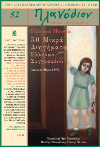 … γράφει ο Γιώργος Αράγης [«Ο γείτονας», σ. 902] μεταφέροντας τις σκέψεις ενός ανθρώπου που παρατηρεί από το παράθυρο του γραφείου του τον γείτονά του απέναντι διώροφου σπιτιού μπροστά σε μικρή ρομβοειδή πλατεία και βρισκόμαστε στο δεύτερο και τελευταίο μέρος της αφιερωματικής συλλογής μικρών ελληνικών διηγημάτων (παρουσίαση του πρώτου μέρους στο προηγούμενο τεύχος του περιοδικού εδώ). Οι Γιάννης Πατίλης, Ηρώ Νικοπούλου και Βασίλης Μανουσάκης επιμελούνται και αυτό το τεύχος, η Ηρώ Νικοπούλου φιλοτεχνεί και το υπέροχο έργο του εξώφυλλου. Και βέβαια και ετούτα τα μικρά κομψοτεχνήματα θα προστεθούν