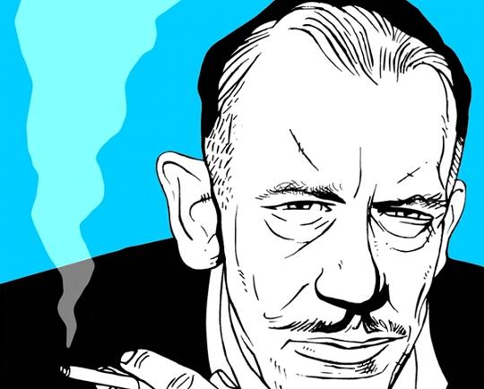 Στις εικόνες: Mikhail Bulgakov, Kurt Vonnegut. John Steinbeck, Philip Kerr, John Banville και οι θεατρικοί χαρακτήρες των Robert Frost και Edward Thomas στην αναφερόμενη από την συγγραφέα παράσταση.