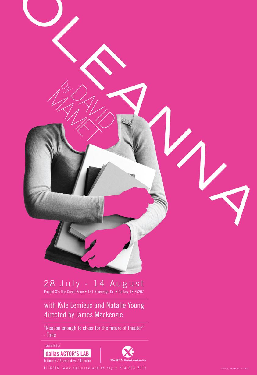 Ολεάνα: το οξύ και κοφτερό έργο του θεατρογράφου των καταιγιστικών διαλόγων με τις πολλαπλές χαρακιές πάνω στη σχέση καθηγητή και φοιτήτριας. Όσο αμήχανα ήταν τα εξώφυλλα των εκδόσεων τόσο σιωπηρώς ομιλητικές είναι οι αφίσες των θεατρικών παρατάσεων ανά τον κόσμο.