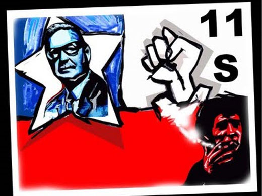 Οι δυο πρώτες φωτογραφίες: Συλλήψεις στο Σαντιάγκο και συλληφθέντες στο Εθνικό Στάδιο της πόλης μετά το πραξικόπημα. Στην τελευταία, ο Victor Jara τελευταίος δεξιά, στην πορεία του UP στο Σαντιάγκο στις 4 Σεπτεμβρίου 1973, μια βδομάδα πριν από το πραξικόπημα [φωτ. Marcelo Montecino].