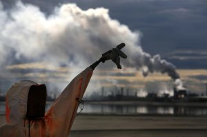 A ‘Bituman’ scarecrow designed to keep migratory birds from landing in the toxic sludge at the tailings pond of the Syncrude upgrader plant north of Fort McMurray. Behind smoke plumes are emitted from the plant.