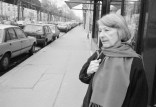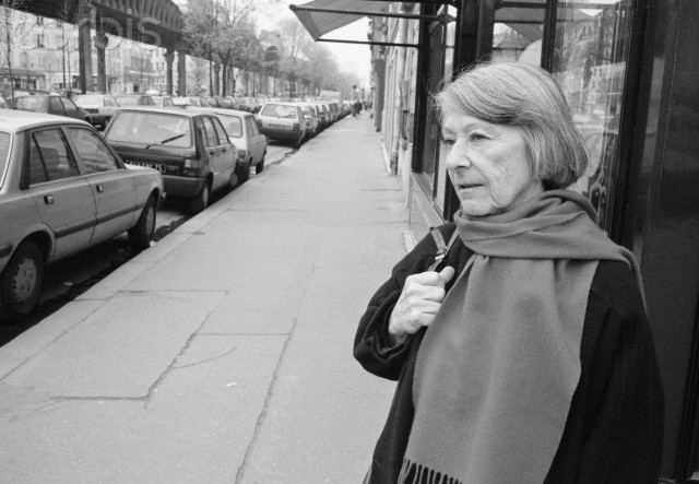 28 Mar 1990, Paris, France — French poet and short story writer Gisele Prassinos stands on a Paris sidewalk. Prassinos is author of La Lucarne. — Image by © Sophie Bassouls/Sygma/Corbis