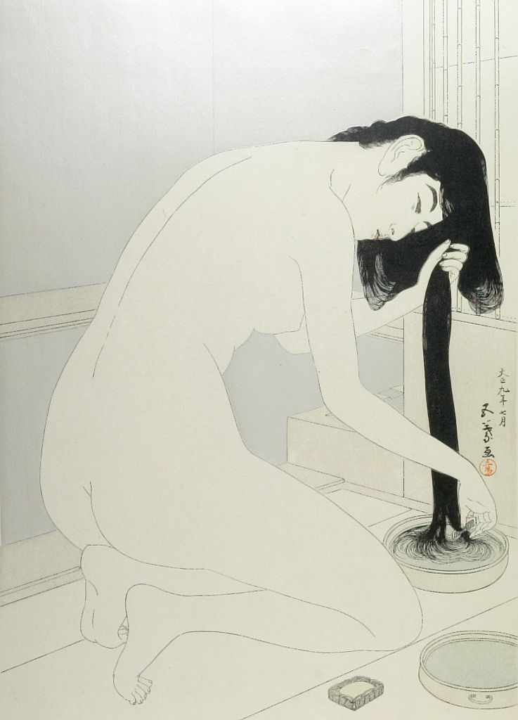 Female Bather Kneeling to Wash and Comb Her Hair, Taishô period, dated 1918