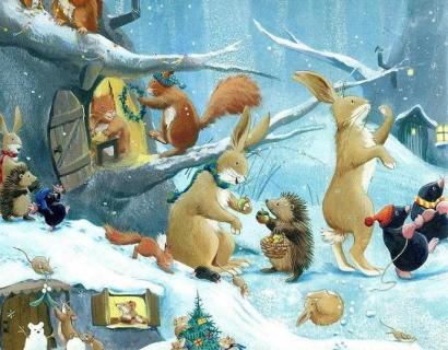 Εμείς δεν το βλέπουμε αλλά τις ημέρες που ονομάζουμε γιορτές υπάρχει και στα δάση μια έντονη δραστηριότητα. Τα ζώα στολίζουν, μαγειρεύουν πουτίγκες και γλυκά, τυλίγουν δώρα και γενικώς συμμετέχουν στον γενικό οργασμό. Τώρα στο πρώτο δισέλιδο μπορούμε να ρίξουμε μια κλεφτή ματιά: μικροσκοπικά και θεόρατα δέντρα στολίζονται, παράθυρα διακοσμούνται, καλάθια γεμίζουν κι όλοι οι ένοικοι του δάσους χαμογελούν.