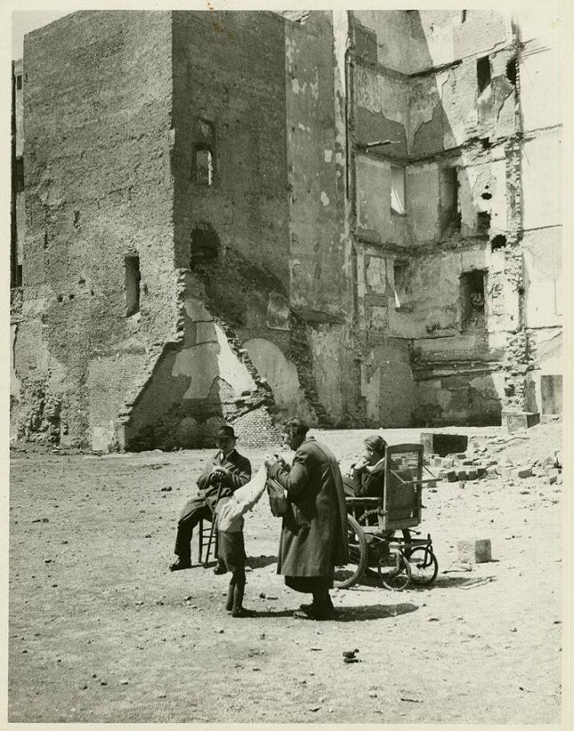Jewish displaced persons rest outside a war damaged courtyard in postwar Vienna=