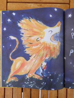 Μπορεί Λία και λιοντάρι να βρίσκονται στις απέναντι άκρες των σελίδων, όμως το μυριζόμαστε πως θα βρεθούν ενώπιος ενωπίω και η στιγμή της συνάντησης και των αμοιβαίων έκπληκτων βλεμμάτων αποδίδεται περίφημα. Φυσικά στο φλέγον ζήτημα ποιος θα γίνει το κατοικίδιο τίνος υπάρχει πλήρης διαφωνία. Η Λία εκθέτει τα επιχειρήματά της -θα του μαθαίνει κόλπα, θα ζουν περιπέτειες μαζί- αλλά και το λιοντάρι αντιπαρατάσσει τα δικά του: θέλει να ζήσει τις δικές του περιπέτειες, έχει τα δικά του όνειρα. Κι όταν η Λία το ρωτά σε τι είδους περιπέτειες αναφέρεται, ο λιοντάρι της δίνει την ουσία τους: δεν τις γνωρίζει ακόμα γιατί μια καλή περιπέτεια είναι πάντα μια έκπληξη!