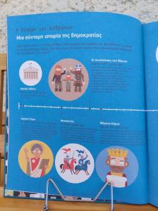 Ο συγγραφέας και εικονογράφος εδώ βάζει ένα μεγάλο στοίχημα: να παρουσιάσει με εικόνες κατάλληλες, κάποτε και μεταφορικές, κάθε κρίσιμο στοιχείο της δημοκρατίας. Τι είναι η δημοκρατία; Πώς γίνεται όλοι οι άνθρωποι να διαμορφώνουν τους κανόνες και να αποφασίζουν για την ζωή τους, σε σημείο να μιλάμε για έναν λαό που κυβερνάται αλλά και κυβερνά; Πώς λειτούργησε στην Αρχαία Αθήνα; Μπορούμε σε δυο σελίδες να δούμε μια σύντομη ιστορία της δημοκρατίας ανά τον κόσμο;